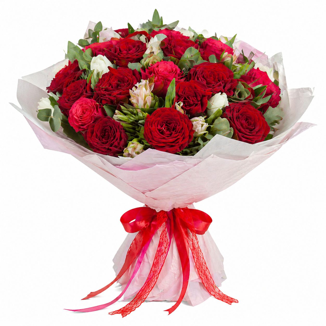 Роза одноголовая красная, альстромерия белая, тюльпан белый, эвкалипт. Упаковка (лента, пленка, крафт, сетка, пленка матовая)